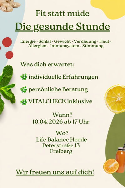 Der nächste Termin ist am 10. April 2026 von 17 – 18 Uhr bei Life Balance Heede, Peterstraße 13 in Freiberg. Anmeldung über Tel. 0175 2049 766. Das Angebot ist kostenfrei!